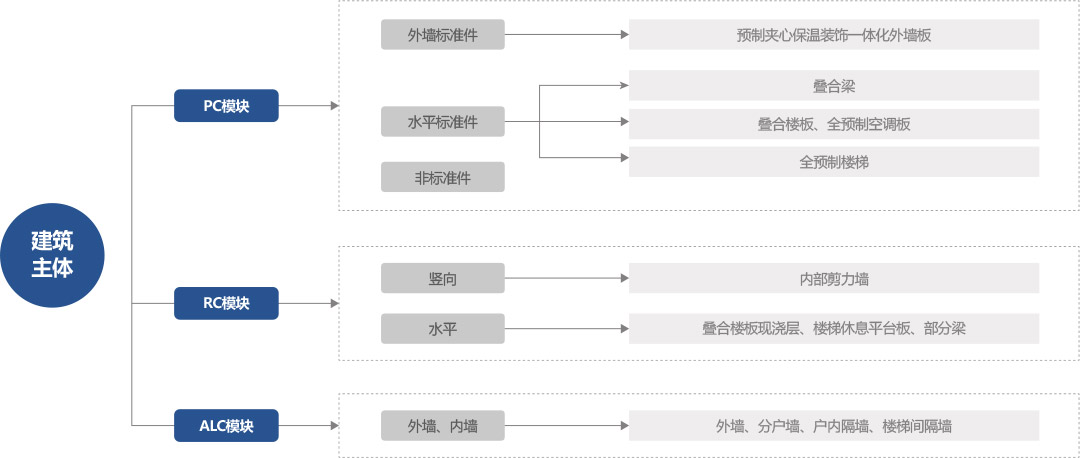 建筑主体可分为现浇模块和预制模块,预制模块又可分为PC模块和ALC模块。