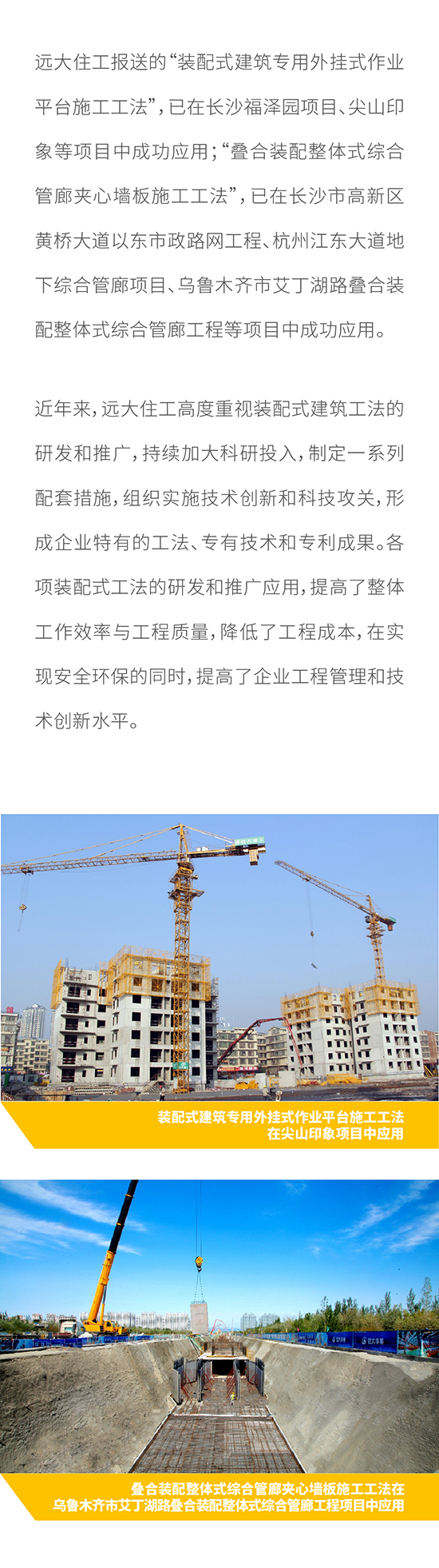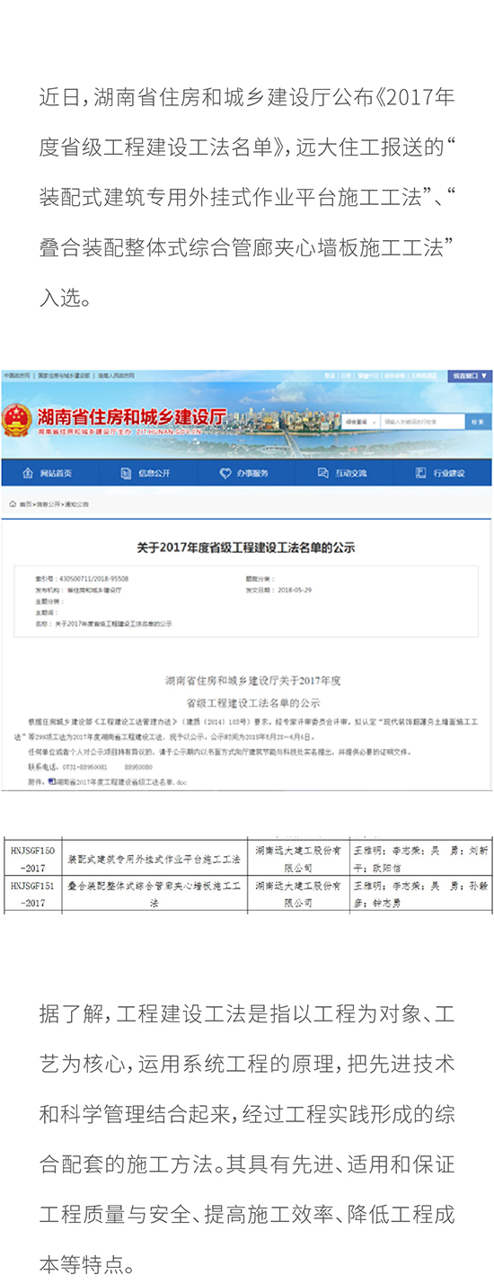 远大住工两项工法入选获评 2017年度湖南省级工程建设工法